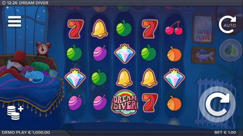 With clear inspiration from the 70s, and full of psychedelic style fruit symbols, Dream Diver will not be the type of game to put you to sleep though. You see the sleeping man and his cat on the left side, on the bed, while on the walls of his room you will find hippie signs with Love Peace messages, along with other objects that are in a similar style.